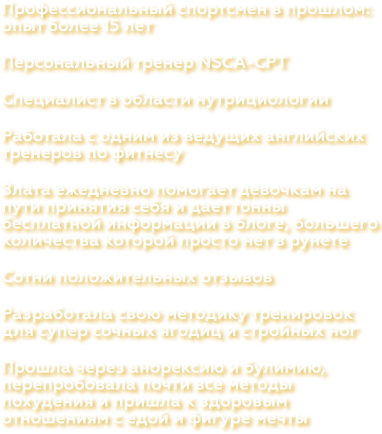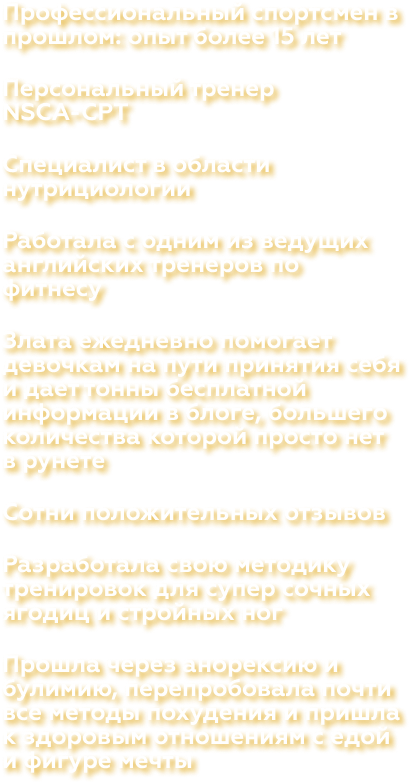 Во-первых вы вряд ли найдёте тренера в странах СНГ, который будет так хорошо разбираться в построении ягодичных мышц, как это делают, к примеру, в Америке. За основу моих же программы тренировок и всей информации на курсе взяты труды лучших специалистов в сфере прокачки ягодиц в мире, таких как Брет Контрерас, Бред Шонфилд и др.